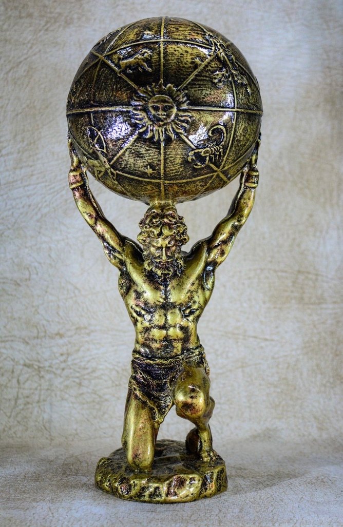 Parlak altın renkli, Atlas figürlü heykel. Diz çökerek burç sembollü küreyi tutuyor, detaylı kas ve göksel tasarım içeriyor.