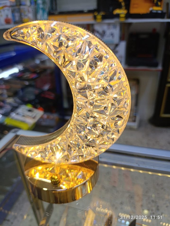 Altın renginde, parlak ve keskin detaylı ay şekilli masa lambasıdır. Işığı yansıtarak göz alıcı bir efekt oluşturur.