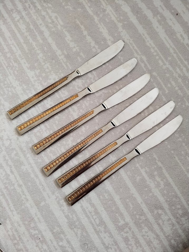 Altın renkli parlak saplara sahip, dekoratif detaylı altı bıçak seti. Bıçaklar gümüş renkli ve düz kesimlidir. Tatlı ve kahvaltı bıçağı olarak kullanılabilir
