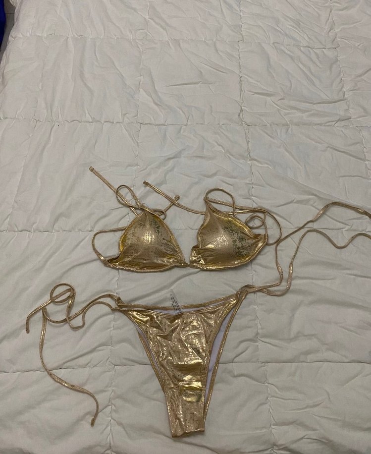 Parlak altın desenli, ince askılı, bikini. Avangart ve bohem tarzıyla şık ve dikkat çekici. ✨ L beden- defosuz- hiç giyilmemiştir- aynı gün kargo