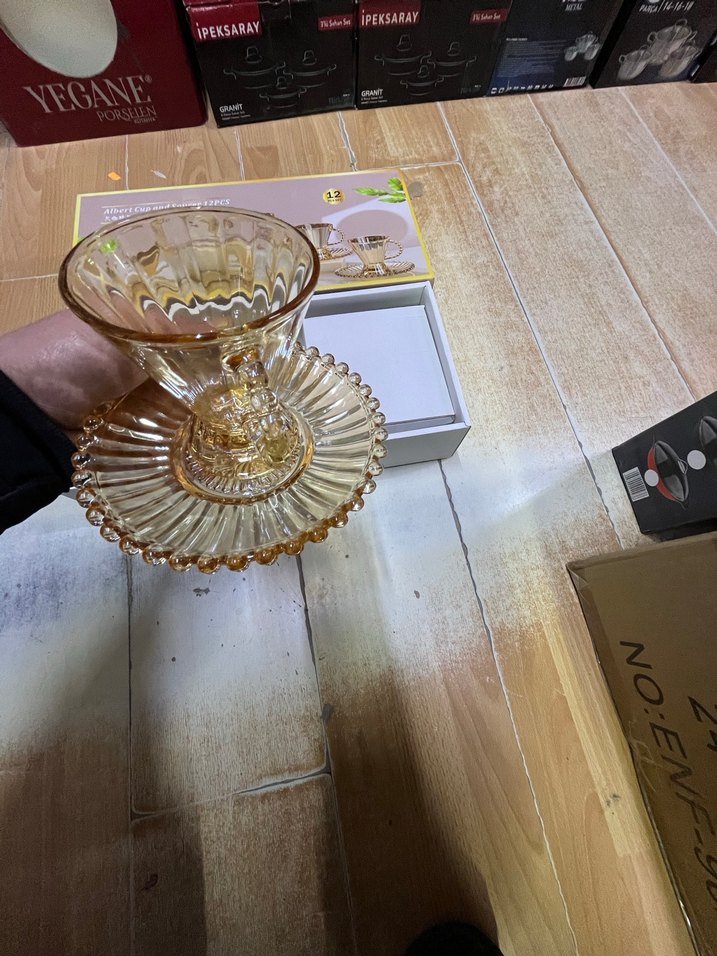 Parlak altın renkli cam fincan ve uyumlu tabak, dokulu tasarımıyla şık bir görünüm sunar. Sofralara zarafet katar. 12 parçadır ürün
