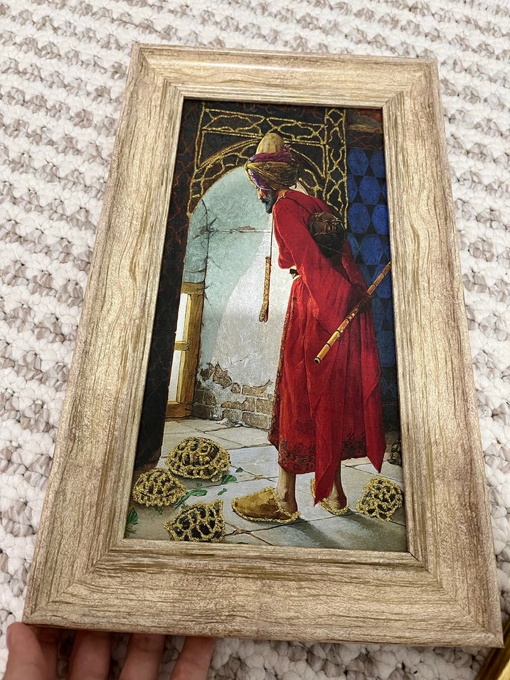 Altın renkli parlak çerçeveli bu tabloda, kırmızı kıyafetli bir figür kemerli bir odada kaplumbağalara bakıyor.