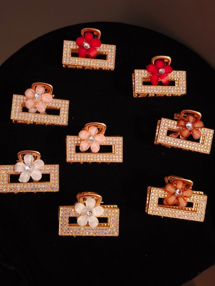 Altın renkli, pul işlemeli ve çiçek tasarımlı plastik saç tokaları. Saçlara ışıltılı ve modern bir görünüm katar.