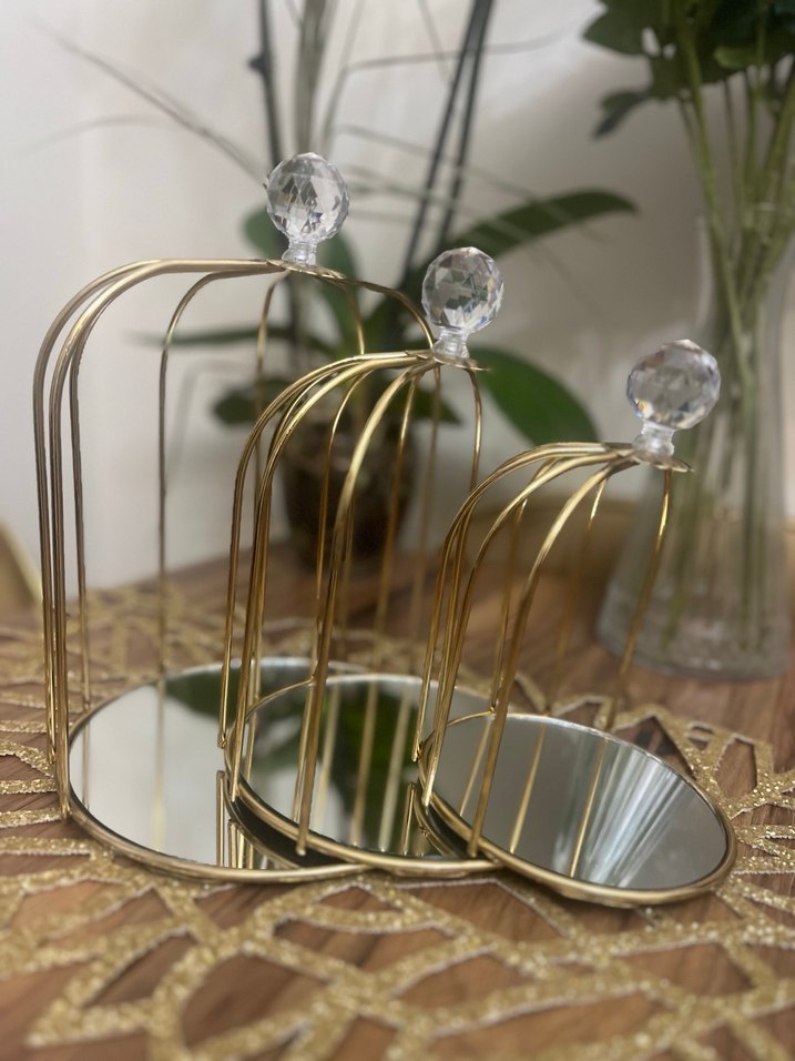 Altın renkli parlak dekoratif kafesler, aynalı taban ve kristal görünümlü topuzlarla ev dekoruna şıklık katıyor. ✨ 3 lü satılmaktadır gold, gümüş