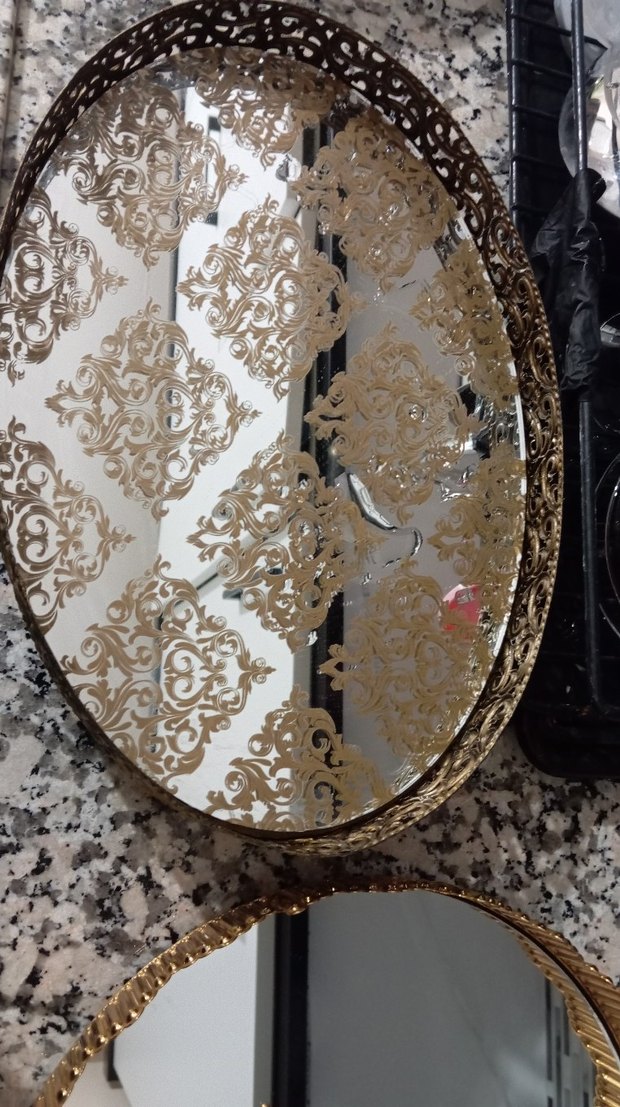 Parlak altın renkli oval ayna, yüzeyde detaylı dekoratif desenlere sahiptir ve mekana şıklık katar. Aynali tepsi söz şekerim bu tepsideydi kullanisli