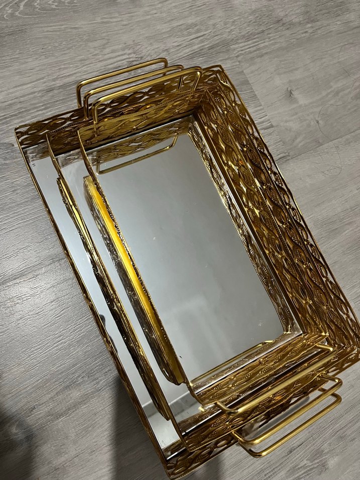 Şık sunum tepsisisi 3 lü takım Çok iyi durumda en küçüğünde 1 kez yüzük kesildi ihtiyaç fazlalığı hiç kullanılmadı.