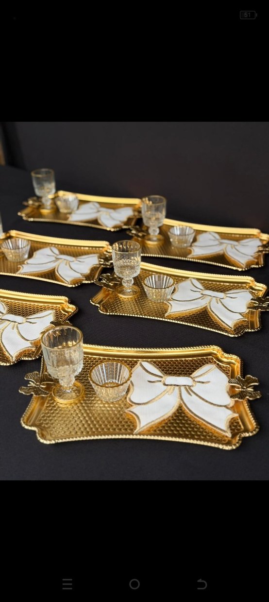 Parlak altın renkli, beyaz fiyonk desenli şık tepsi seti. Her tepsi dokulu yüzeye ve uyumlu küçük bardaklara sahiptir. ✨ 6lı tepsi 6lı peçete 6lı lokumluk 6lı su bardak 24 parça tüm set Ptt kargo Mng kargo