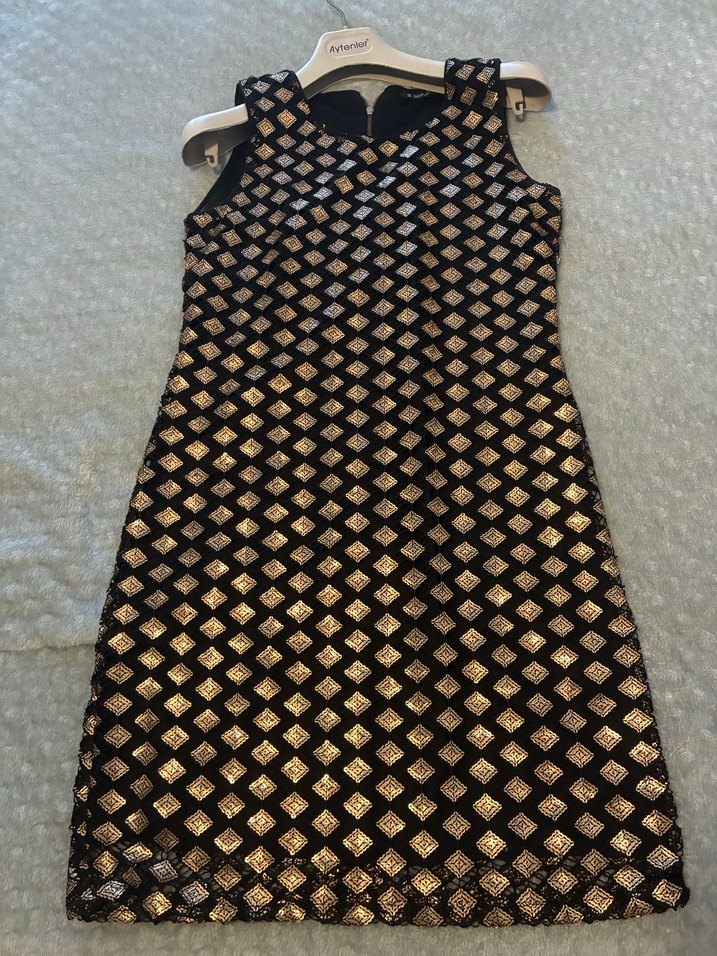 Kolsuz, v yaka, dar kesim abiye elbise. Parlak altın renkli yılan desenli ve payet detaylı, gece partileri için uygun. ✨