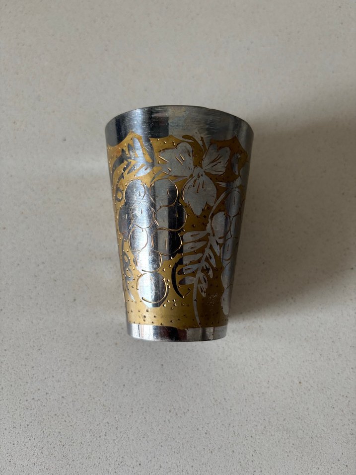 Altın renkli, parlak metal bardak, üzeri çiçek ve üzüm desenleriyle süslenmiştir. Kompakt ve dekoratif, ölçü bilgileri görselde mevcuttur