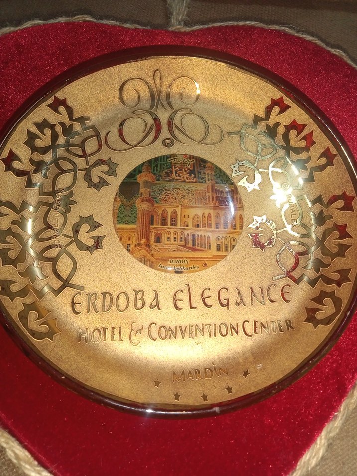 Parlak altın renkte, üzerinde basılı dekoratif desenler ve "ERDOBA ELEGANCE HOTEL & CONVENTION CENTER" yazısı bulunan dekoratif tabak. Ortasında bina resmi yer alır. ️