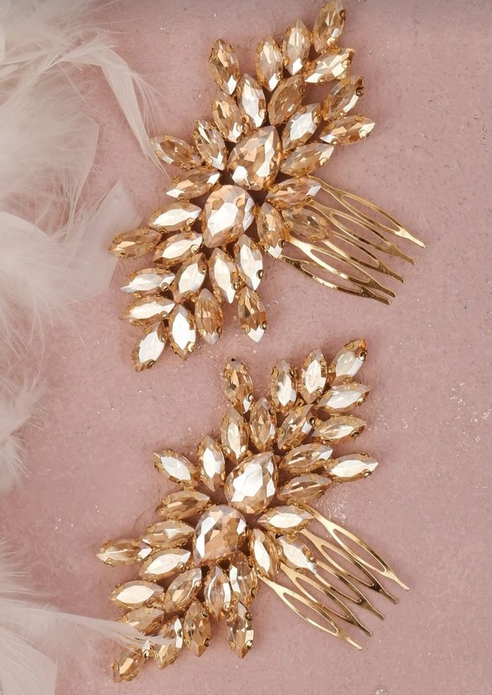 Altın Renkli Parlak gelin nişan Taşlı Saç Tokası Çifti