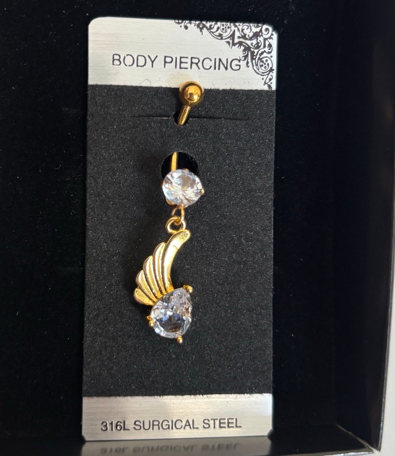 316L cerrahi çelikten yapılmış, altın renkli, kanat ve parlak taş detaylı göbek piercing. ✨