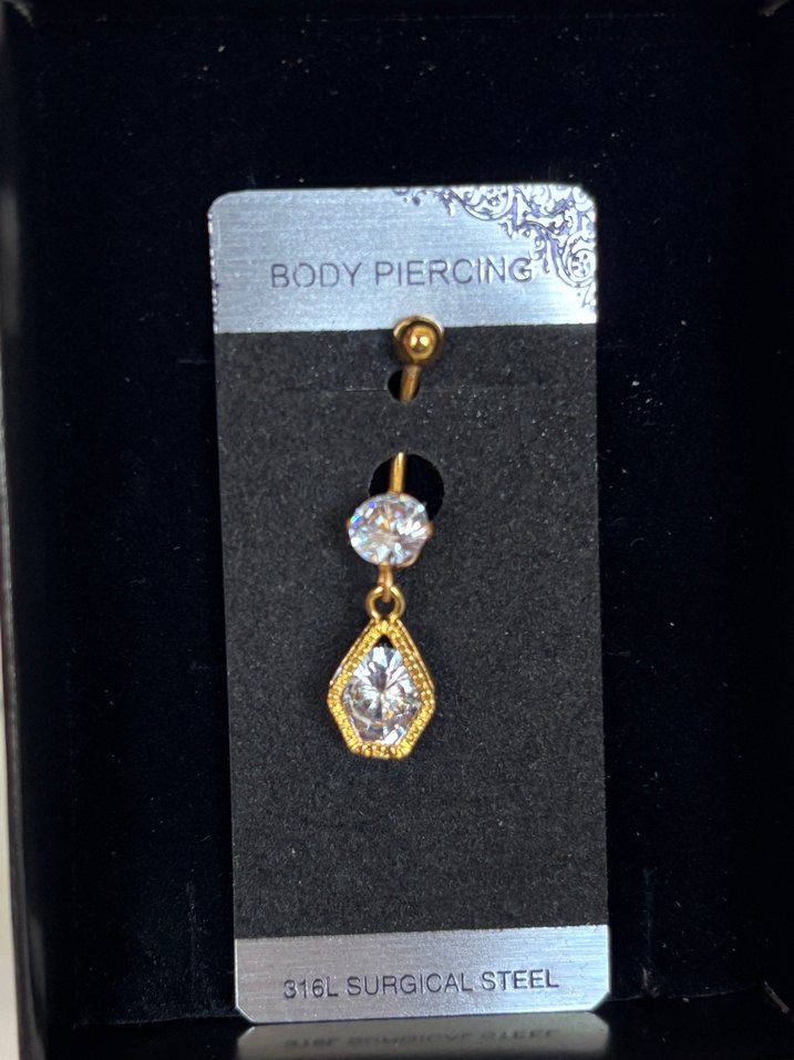 Cerrahi çelikten yapılmış, altın renkli ve parlak payet detaylı gövde piercingi, cesur gotik tarz için uygundur. ✨