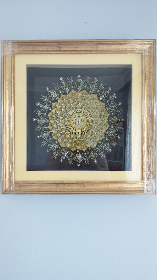 Ortada detaylı Arapça hat bulunan parlak altın renkli tablo, uyumlu altın çerçeve ile tamamlanmıştır. ️. boyutu 50/50