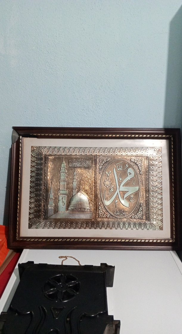 Bu parlak altın renkli tablo, cami ve Arapça yazı içeren İslami motiflerle koyu ahşap çerçeveye sahiptir. ️