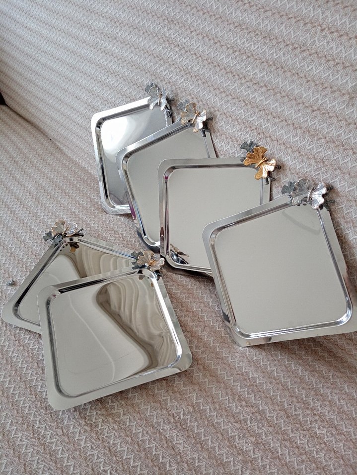 Parlak altın renkli kare tepsiler, çiçek detaylı kulplarıyla servis veya sunum için uygun mutfak aksesuarı. ((( Ürün hediye geldi çok hiç kullanmadım kulpları da görsel çekimi için taktım sadece çiçeklerin rengi soldu durdukça o yüzden fiyatı uygun tutuyorum ve vidaları iyi takamadım sanırım o yüzden kalpler sallanıyordu normal de de öyle mi yoksa vidalar mı tutmuyor bilmiyorum alan ona göre dikkat edip alsın lütfen iade kabul etmiyorum)))