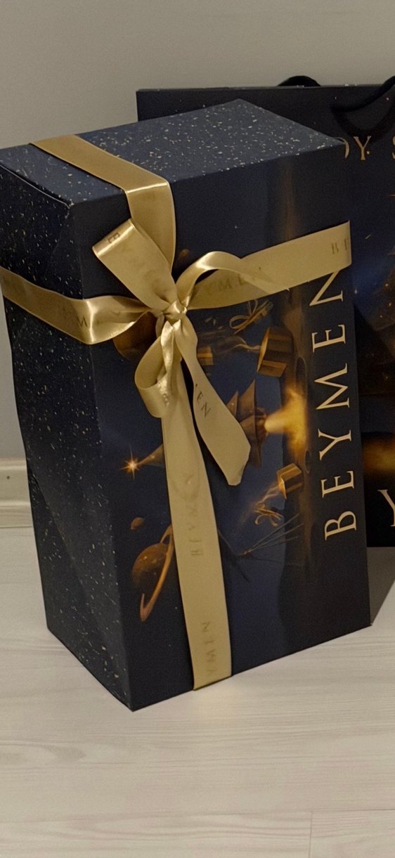 Parlak altın renkli kurdele ile sarılmış, koyu renkli yıldız desenli hediye kutusu. Kurdele üzerinde 'BEYMEN' yazısı bulunur. Büyük boy ölçüler resimde ekli