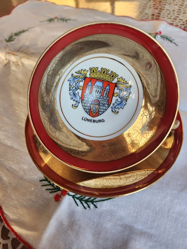 Ortada Lüneburg arması bulunan, kenarları kırmızı ve ince altın detaylı parlak altın renkli tabaklar seti. Zarif işçilik sunar. ️