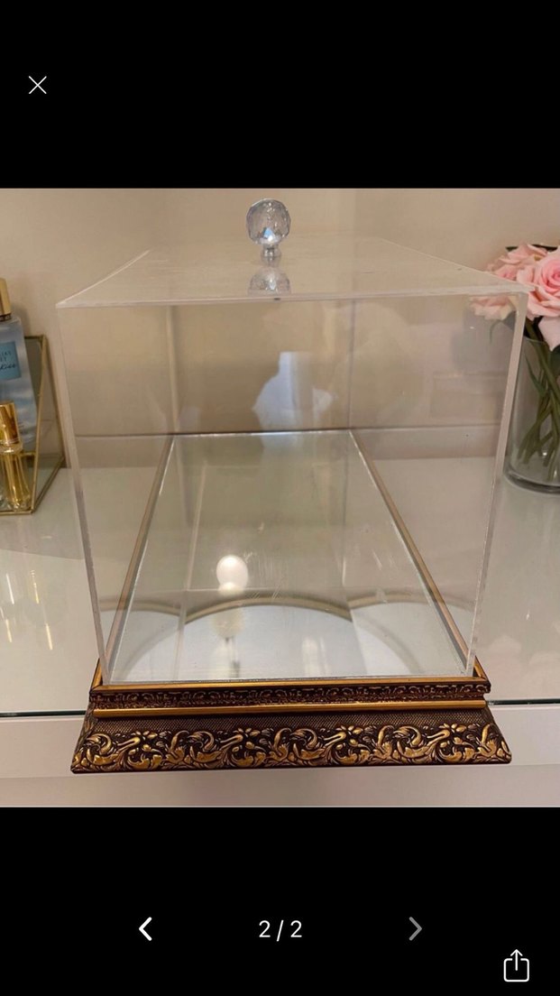 Parlak altın renkli işlemeli taban ve kristal görünümlü kulplu şeffaf kapaklı makyaj organizeri.