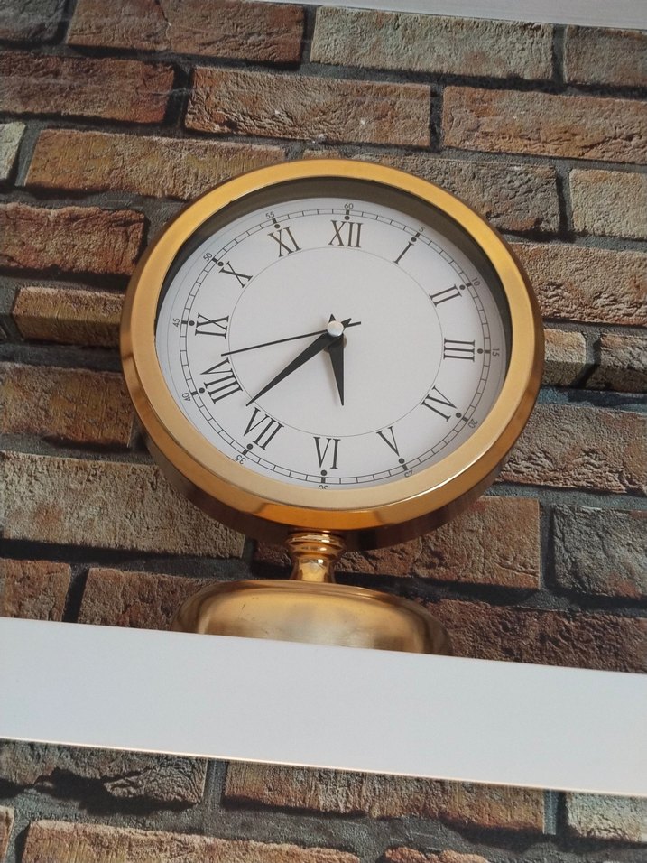 Parlak altın renkli masa saati, Roma rakamları VI ve XII ile klasik yuvarlak kadran ve şık tasarıma sahiptir. ⏰