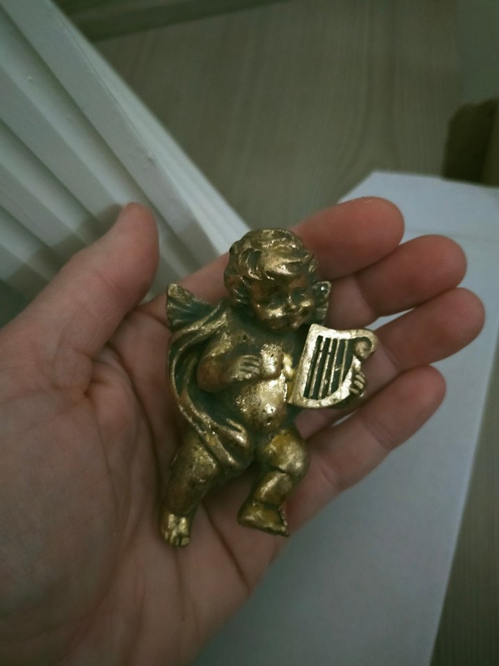 Parlak altın renkli, elinde arp tutan melek figürü. Detaylı ve avuca sığan biblo.
