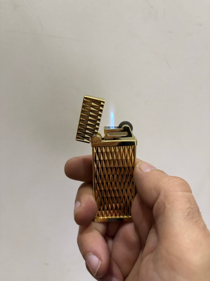 Parlak altın renkli metal çakmak, dokulu gövde ve kapaklı klasik tasarıma sahip, mavi alev çıkarır.