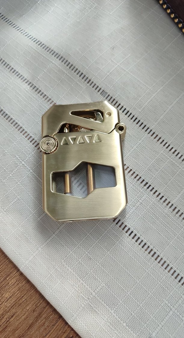 Parlak altın renkli metal çakmak, benzersiz geometrik tasarım ve oyma detaylara sahiptir. Şık ve kullanışlı bir aksesuardır.