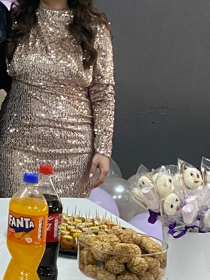 Altın renkli, v yaka ve uzun kollu bu parlak mini abiye elbise, parti için ideal şık ve dar kesim bir tasarıma sahiptir.