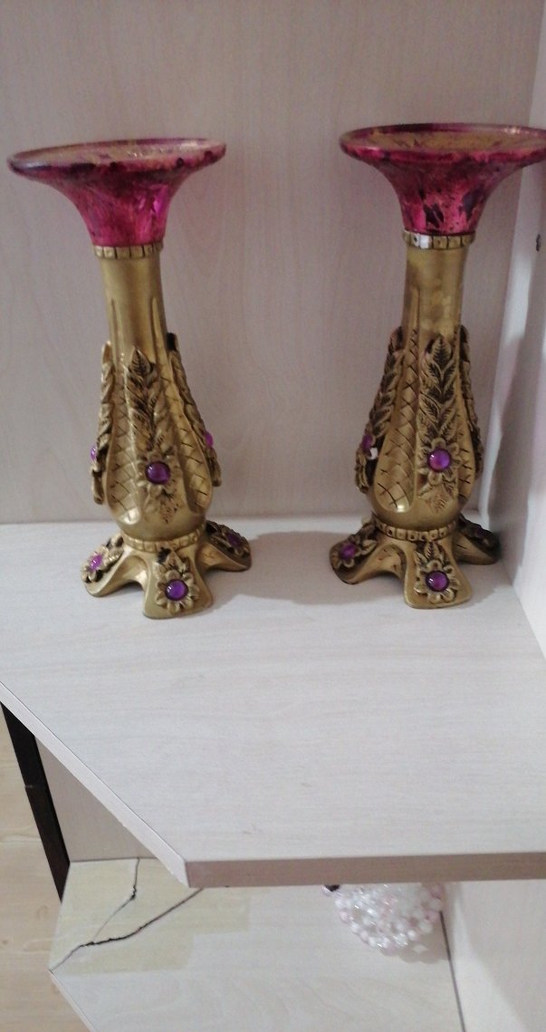 Mor taş detaylı, yaprak desenli parlak altın renkli çift mumluk seti. ️2 li fiyat sorunsuzdur