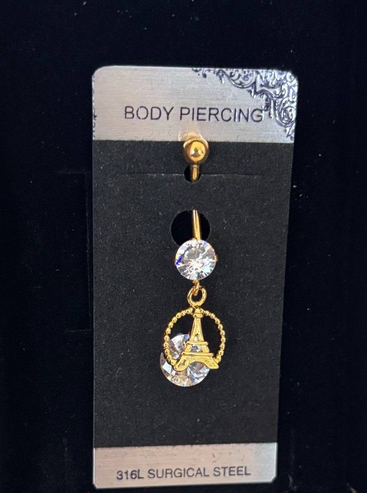 Altın renkli, payetli Eyfel Kulesi figürlü göbek piercingi, 316L cerrahi çelikten, cesur rock punk tarzına uygun. ✨