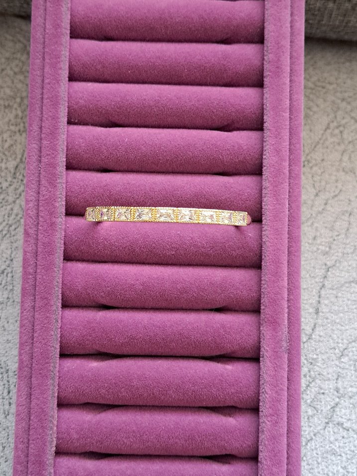 Altın renginde, parlak payet detaylı kadın bileklik. Düğünler için modern klasik tarzda, desen içermeyen şık bir tasarım.