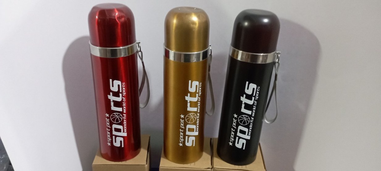 Parlak altın renkli termo şişe, kapaklı ve taşıma kayışlıdır. Spor temalı baskıya sahiptir. siyah ve kırmızı renkler mevcuttur