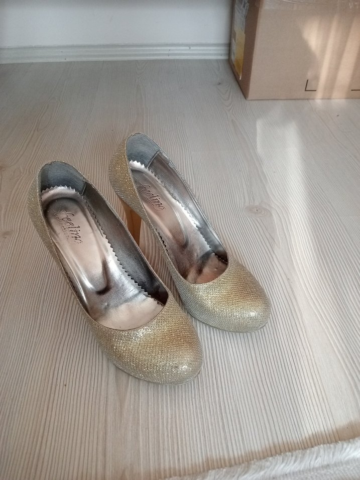 Altın renkli, parlak stiletto topuklu kadın ayakkabısı. Sim detaylı, kauçuk malzemeden yapılmış, düğün için uygun modern klasik tarzda. ✨