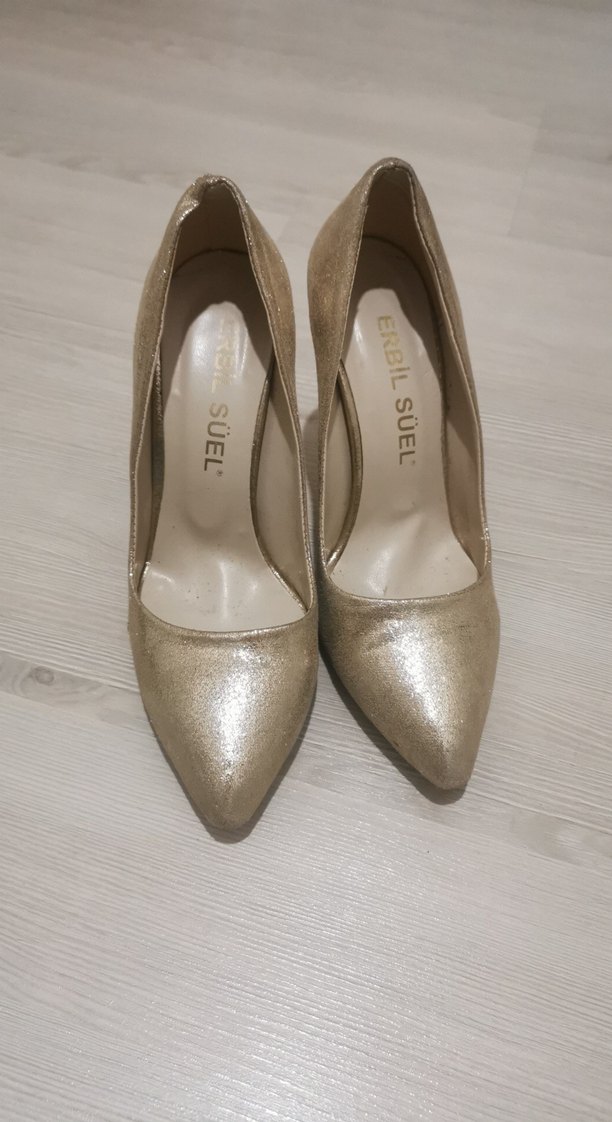 Altın renkli süet stiletto, parlak sim detaylı ve hafif yılan desenli. Modern klasik tasarım, düğün için uygun. Marka: Erbil süel