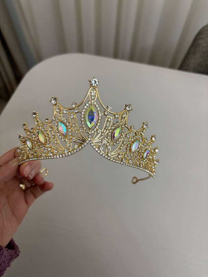 Altın renginde, parlak taşlarla süslenmiş, bohem tarzda gösterişli bir taç.