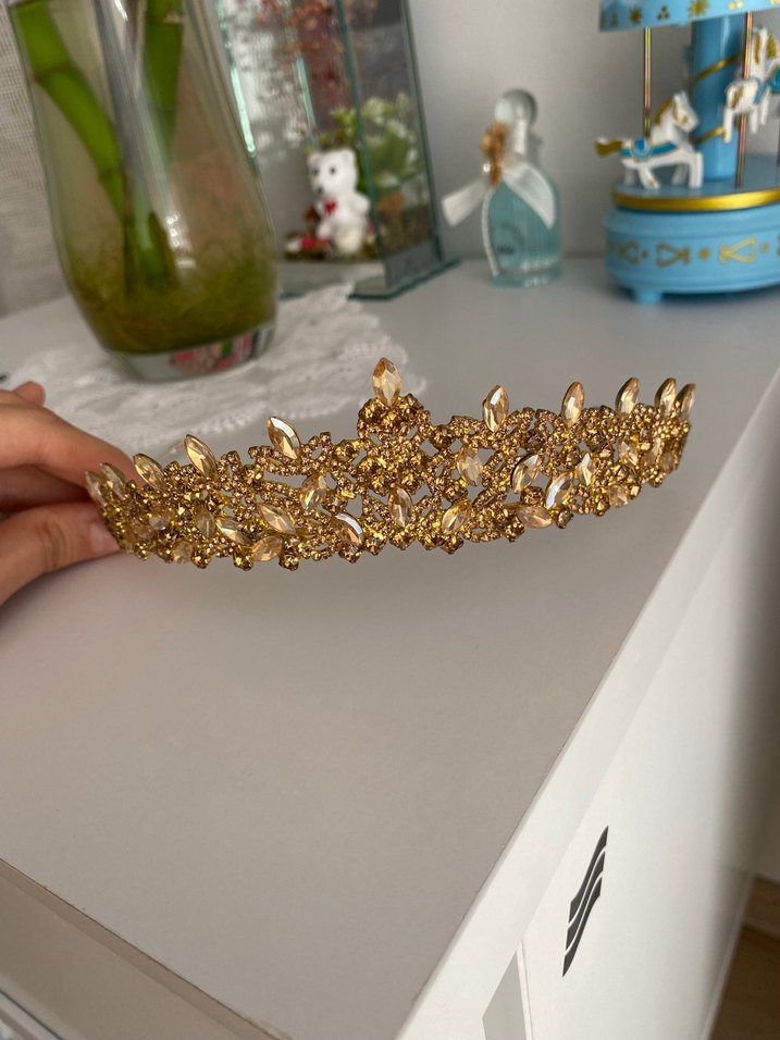 Altın renkli, parlak taşlarla süslenmiş bu gelin tacı, klasik ve gösterişli bir şıklık sunar.