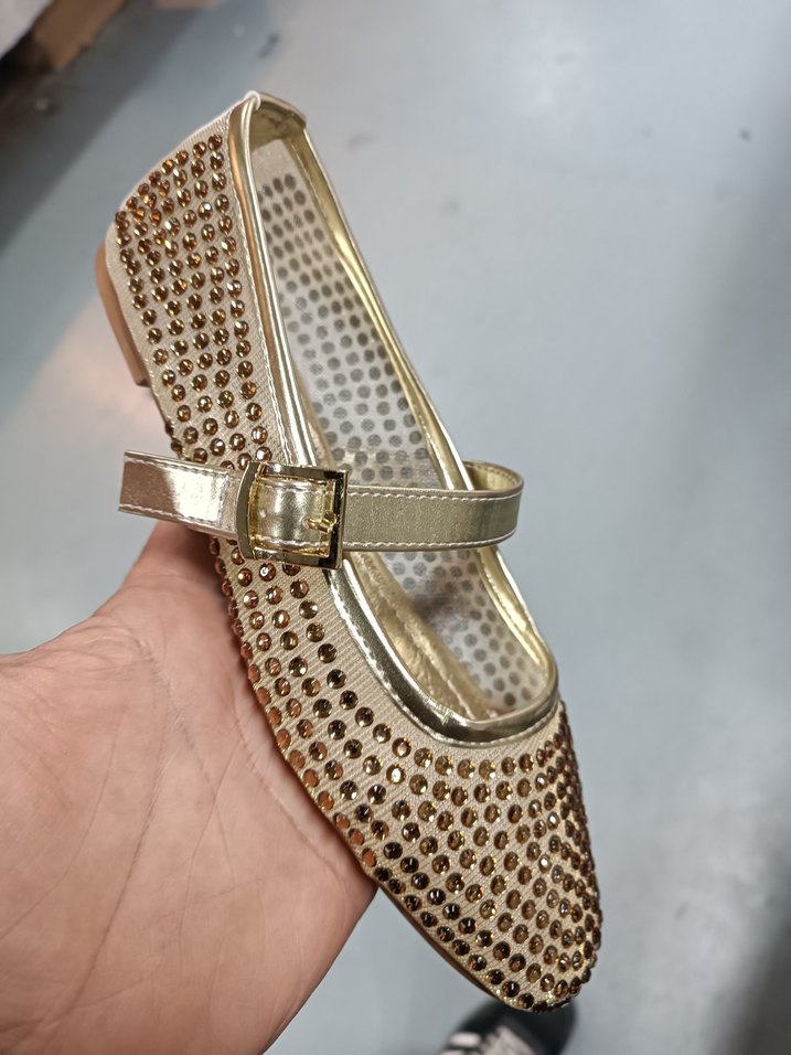 Altın renkli, parlak taşlarla süslenmiş stiletto topuklu kadın babet. Yılan derisi desenli ve kauçuk tabanlıdır. Günlük kullanıma uygundur, tokalı bantlıdır. ✨