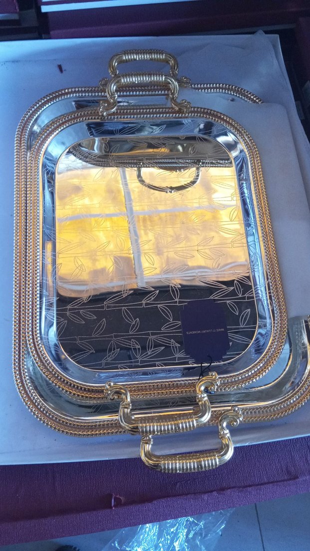 Parlak altın renkli, yaprak desenli, dekoratif saplı tepsi seti. Sunum veya servis için uygundur. ️3 tepsiden olusmaktadir takimdir
