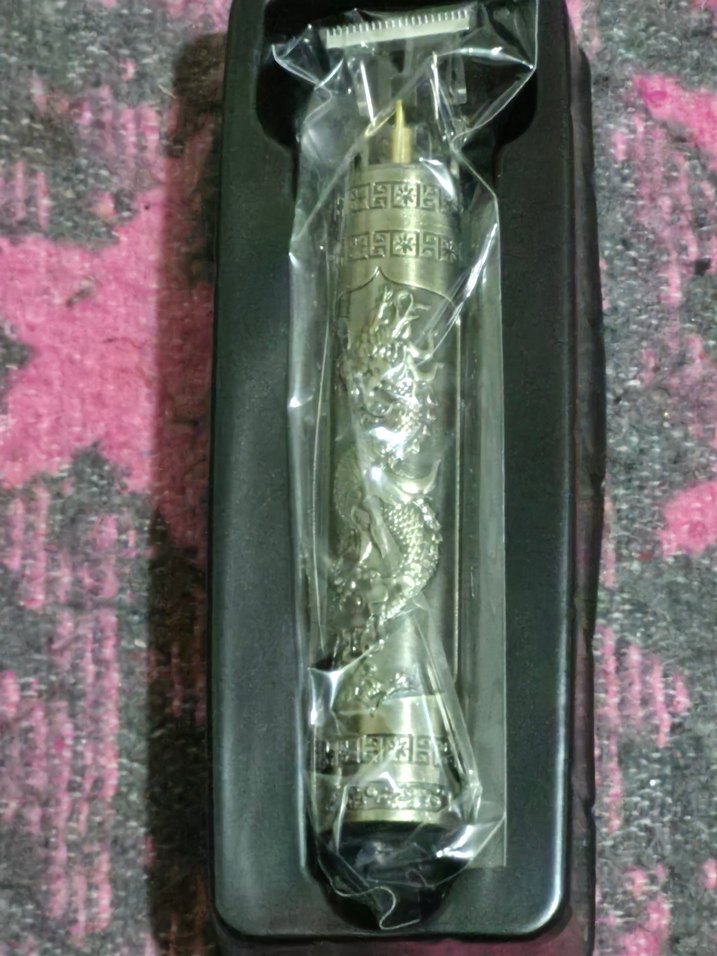 Parlak altın renkte, ejderha desenli detaylı kabza ile şık tıraş makinesi. Koruyucu siyah kutu ile birlikte.. günlük evde bakim