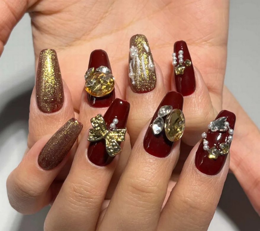 Altın renkli, parlak tırnak süslemeleri; fiyonk, inci ve büyük taş detaylarıyla tırnak dekorasyonunu zenginleştirir.
