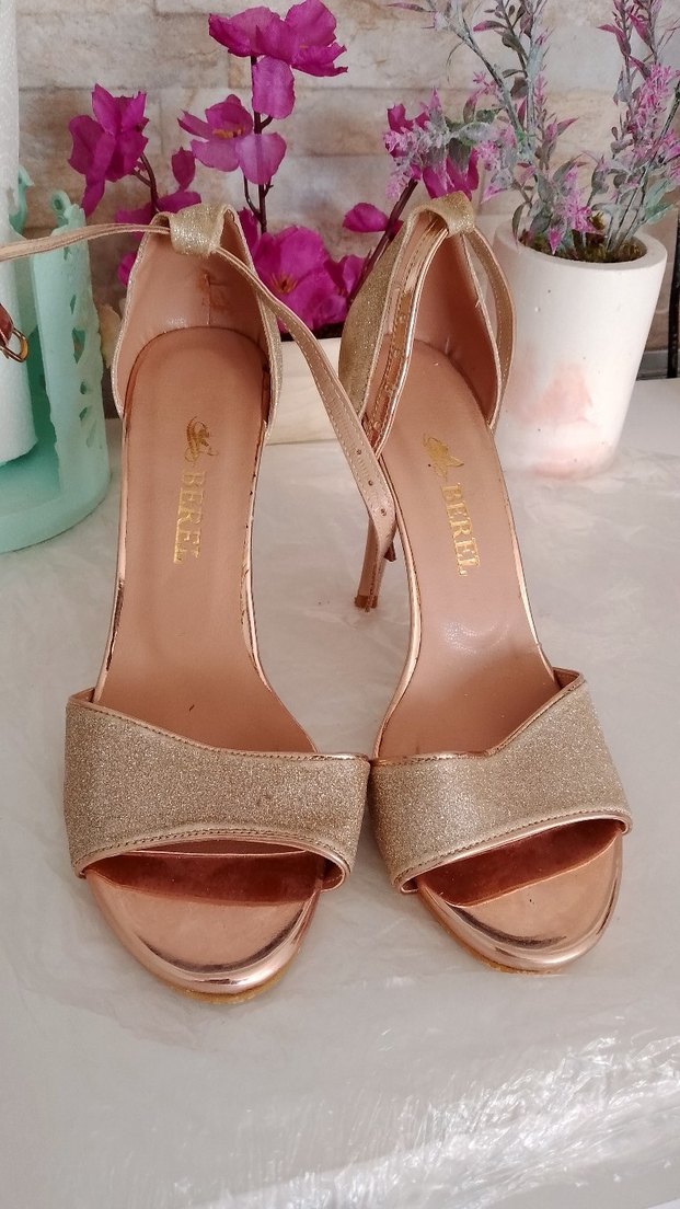 BERER markalı, parlak altın renkli, tokalı bantlı, çiçek desenli stiletto topuklu kadın ayakkabısı. Modern klasik tarzda, kauçuk malzemeden üretilmiştir.