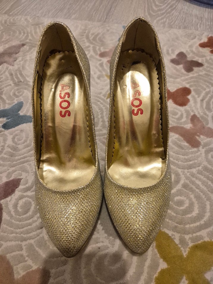 ASOS markalı, sentetik kumaştan yapılmış, parlak ve ışıltılı altın renkli topuklu ayakkabı. Düğün ve özel davetler için uygundur. 8 cm topuk