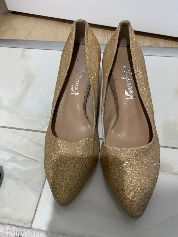 Altın renkli, parlak sim detaylı kadın topuklu ayakkabı. Düğün ve özel günler için modern klasik tarzda, kauçuk malzemeden üretilmiştir.