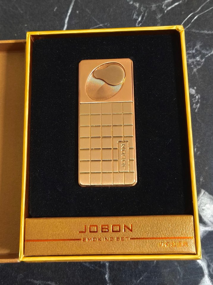 Parlak altın renkli USB çakmak, grid desenli dikdörtgen tasarıma ve kavisli ateşleme alanına sahiptir. Jobon marka USB kablosu ve kutusuyla birlikte gelir.