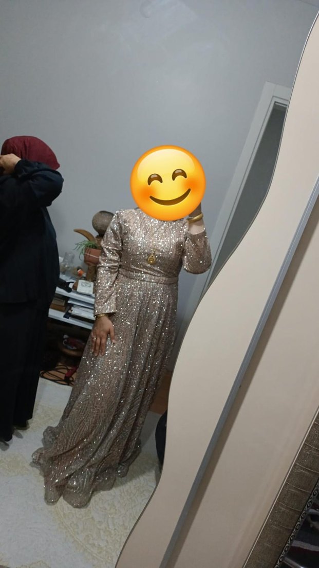 Altın Renkli Parlak Uzun Kollu Abiye Elbise