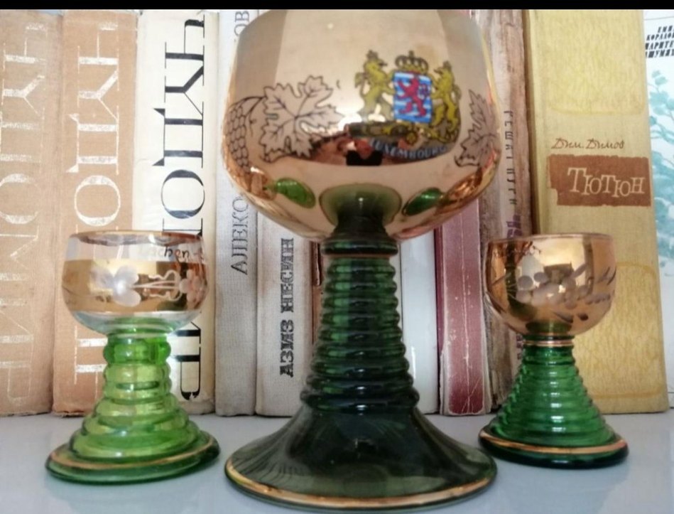 Küçükler adet 600, büyük 1100 tl Parlak altın renkli kase, detaylı armalar ve dokulu yeşil sap ile vintage kadeh.