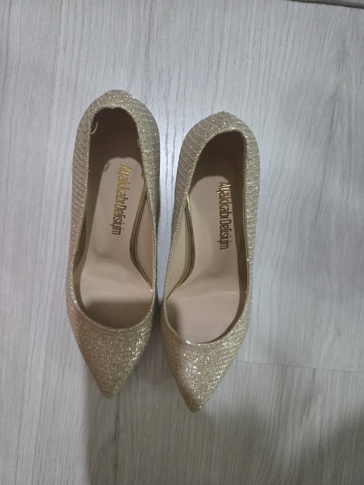 Altın renkli, parlak yılan desenli ve simli ince topuklu kadın ayakkabısı. Düğün ve özel anlar için uygun, rahat kauçuk malzemeden yapılmıştır. ✨