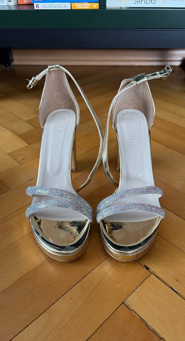 Parlak altın metal malzemeden yapılmış, simli bantlara ve yılan desenine sahip yüksek topuklu abiye ayakkabılar, düğün ve özel günler için uygundur. ✨