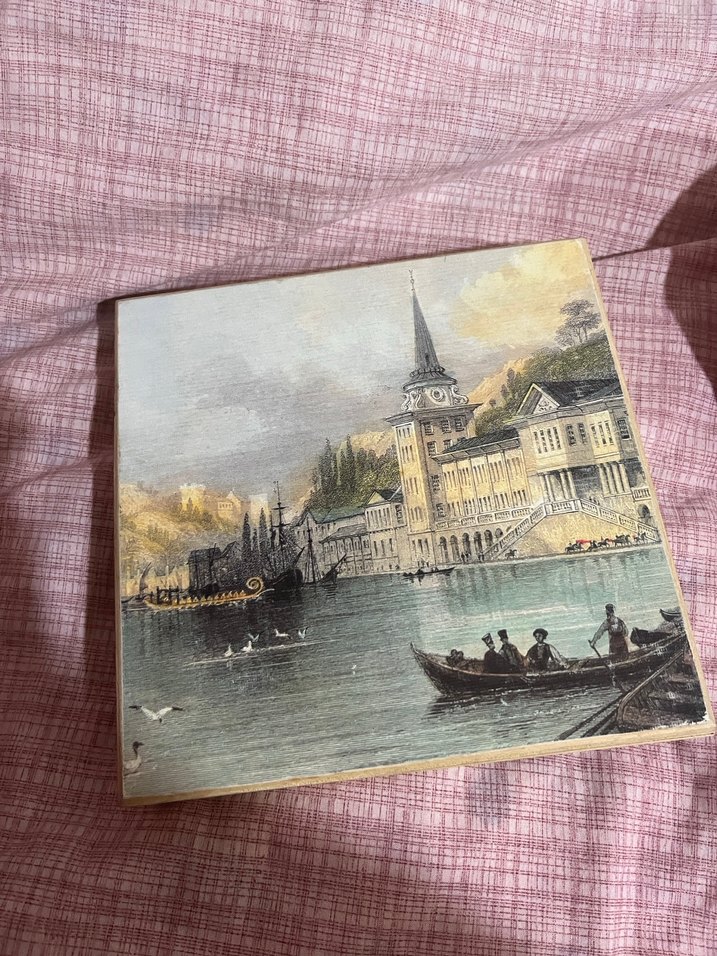 Pastel tonlarda, altın renkli şehir manzarası tablosu. Su üzerindeki tekneler ve tarihi binalar detaylı şekilde tasvir edilmiştir. Tahta kutu