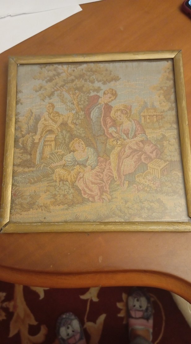Altın renkli çerçeveli, pastel tonlarda klasik figürlerin yer aldığı tablo. Doğal bir ortamda sahne betimlenmiştir. baskı goblen